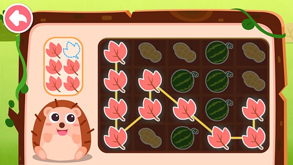 4、小刺猬上方需要找到六片树叶状的图案,只需要把六片树叶连成一条线就行了。